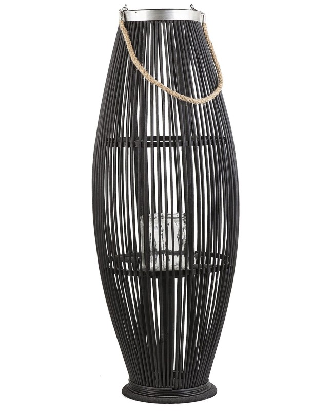 Cette grande lanterne noire décore magnifiquement tous les intérieurs. Faite en bambou, elle repose sur un pied rond et stable et possède également une poignée en corde tressée pour la suspendre et la déplacer facilement. À l'intérieur, il y a un porte-bougie en verre pour créer une ambiance agréable et confortable.