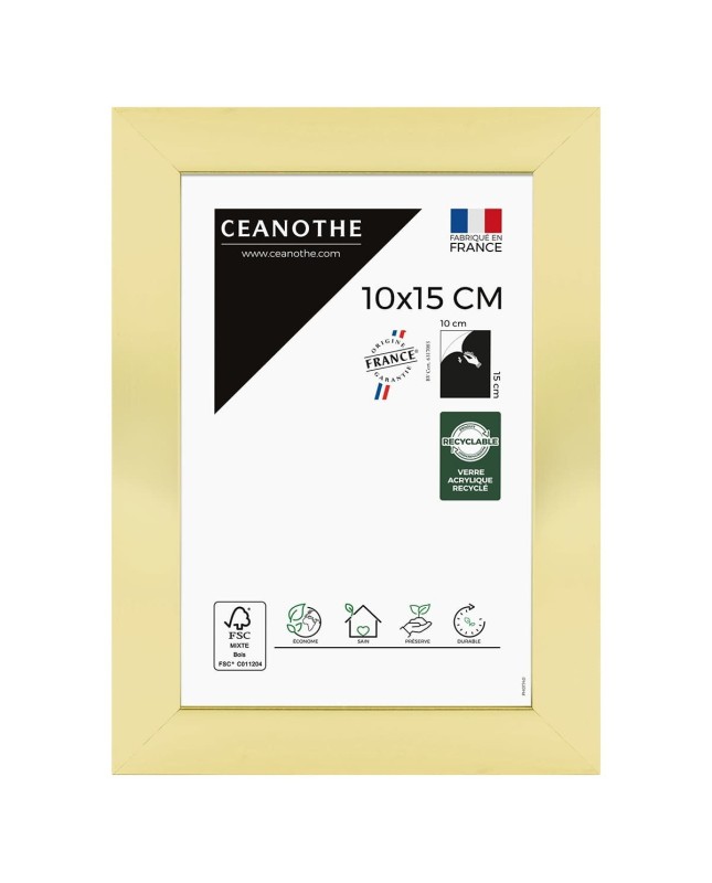 Description : Protégez et mettez en avant toutes vos photos grâce au cadre Precious et son verre acrylique incassable recyclé. Nos verres acryliques ont un film de protection sur chaque face, à retirer lorsque vous insérer votre photo, affiche ou poster dans le cadre photo. 2 films de protections : 1 sur chaque face, à retirer lorsque vous insérer votre sujet affiche ou poster dans le cadre photo. Ce cadre photo format 10X15 cm est idéal pour mettre en avant des photos, posters ou affiches de 10X15 cm. Ajoutez un passe-partout pour protéger et mettre en avant d’autres formats de photos et posters avec ce cadre.La couleur Doré avec finition laquée de ce cadre est moderne et indémodable. Elle fait ressortir toutes vos plus belles œuvres et photos tout en apportant un effet élégant à votre intérieur. Cadre Home déco facile à accrocher, il trouvera naturellement sa place dans toutes les pièces de la maison : hall d’entrée, salon, chambres à coucher. Le cadre sublimera facilement un grand nombre de photos avec une touche déco très tendance. Ce cadre photo 10X15 cm est en résine recyclée, un matériau solide et esthétique. Ses dimensions extérieures sont 177x127x25 mm et se compose de 4 baguettes travaillées de qualité. Il apportera de la profondeur à vos photos avec un rendu design très qualitatif. Les finitions de ce cadre sont soignées. La couleur de cette gamme Precious fait de ce cadre une valeur sûre que vous garderez longtemps. Depuis 1975, Ceanothe perfectionne au quotidien son savoir-faire et expertise sur l’encadrement, la mise en valeur photographique et la décoration murale. Une société française engagée dans une démarche éco-responsable.