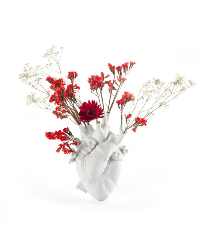 Description : Quand l'anatomie rencontre les sentiments... Ce vase multi-soliflores en porcelaine Love in Bloom en forme de Seletti reproduit de façon très réaliste un cœur humain. Veines et artères forment un réseau de soliflores prêt à contenir une composition florale à votre goût. Offrez votre cœur, au propre comme au figuré, voilà le cadeau idéal pour votre bien aimé(e). Matière : Porcelaine / Support : tréteau en métal laqué Dimensions : L 16,5 cm x larg. 9 cm x H 25 cm Peut être posé sur un meuble ou suspendu à un mur (trou à l'arrière)