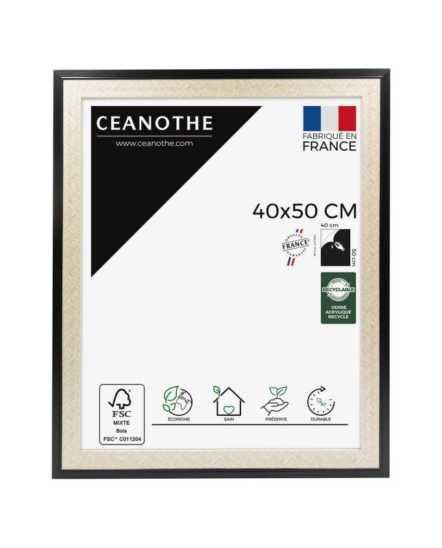 Description : Cadre photo classique et chic, Palma noir 40x50 cm dispose d'une baguette couleur noire en résine recyclée à 80%. Fabriqué en France, ce cadre est recyclable. Il dispose d'un système d'accroches au dos pour être fixé au mur à l'horizontale et à la verticale ainsi que d'un Verre acrylique incassable recyclé à 70%, léger et très résistant pour protéger votre photo, affiche ou poster.