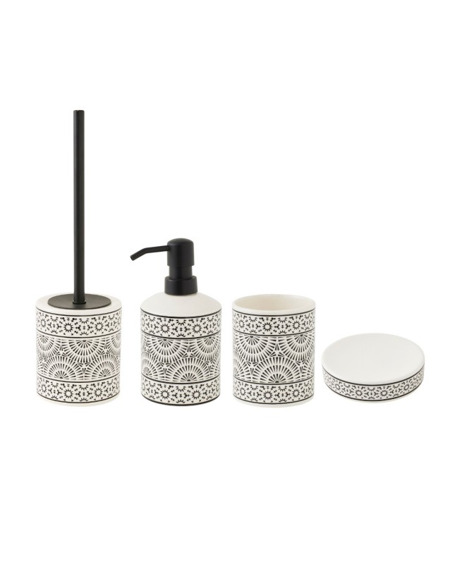 Description : Set de salle de bains blanc avec motifs ethniques - TRIBU - LEVASSEURCe set de salle de bain en porcelaine blanc, fait partie de la gamme TRIBU.Il contient un distributeur de savon, un porte savon, un porte brosse à dent et une brosse WC. Cette gamme est conçue pour transformer vos accessoires de salle de bains en objet de décoration avec son effet de matière.Les pièces existent également à l'unité.CARACTERISTIQUES TECHNIQUES :Couleur: blanc et noirMatière: PorcelaineDimensions distributeur de savon : 7.8x7.8x17cmDimension porte-savon : 10.5x10.5x2.5cmDimensions porte-brosse à dents : 8.5x8.5x9.2cmDimensions porte-brosse WC : 11.5x11.5x39.5cm