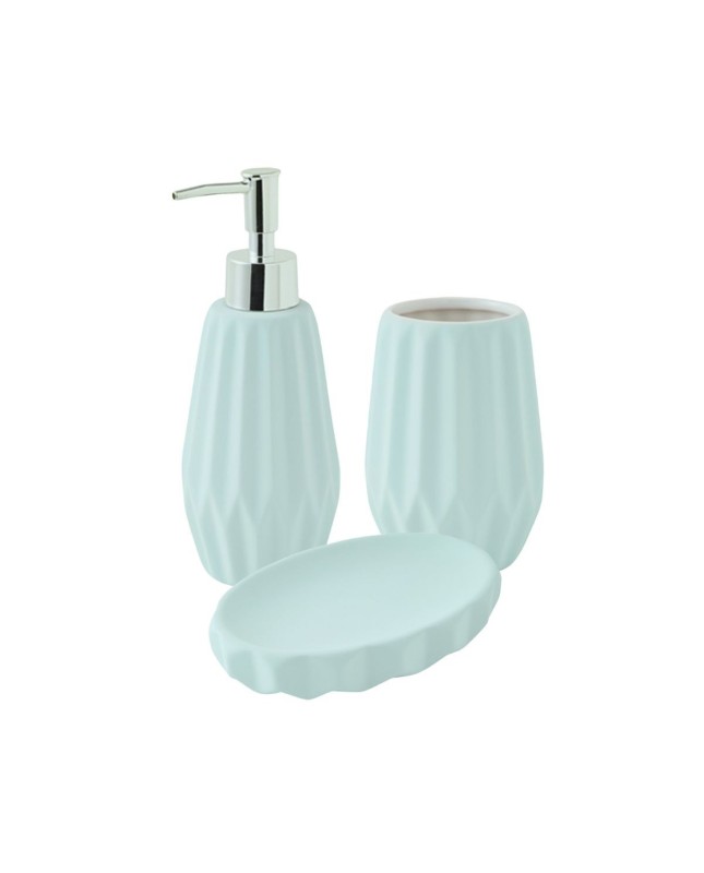 Description : Set de salle de bain - FACETTE - LEVASSEURCe set de salle de bain en céramique, fait partie de la gamme FACETTE.Il contient un distributeur de savon, un porte savon et un porte brosse à dent.Cette gamme est conçue pour transformer vos accessoires de salle de bains en objet de décoration avec son effet de matière.Les pièces existent également à l'unité.CARACTERISTIQUES TECHNIQUES :Couleur: blanc, bleu, gris ou rose poudréMatière: CéramiqueDimensions distributeur de savon : 7.5x7.5x17cmDimension porte-savon : 14x9.5x2.5cmDimensions porte-brosse à dents : 7.5x7.5x11cm