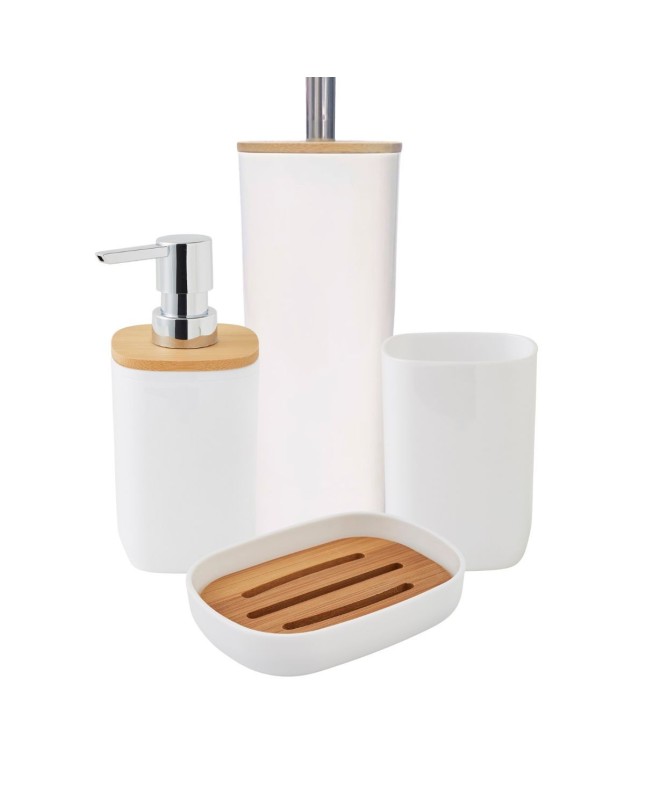Description : Set de salle de bains blanc - SEQUOIA - LEVASSEURCe set de salle de bain en plastique et bambou blanc, fait partie de la gamme SEQUOIA.Il contient un distributeur de savon, un porte savon, un porte brosse à dent et une brosse WC.Cette gamme est conçue pour transformer vos accessoires de salle de bains en objet de décoration avec son effet bois.Les pièces existent également à l'unité.CARACTERISTIQUES TECHNIQUES :Couleur: blancMatière: plastique et bambou Dimensions distributeur de savon : 7.3x7.3x16cmDimension porte-savon : 12.8x8.3x2.6cmDimensions porte-brosse à dents : 7.3x7.3x10cmDimensions porte-brosse WC : 9x9x37cm