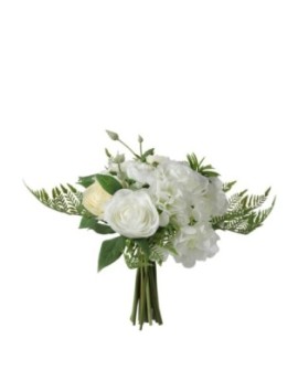Petit bouquet rond artificiel de 17 tiges composé d'hydrangeas, clématites, renoncules et fougères. Idéal pour étoffer la décoration et fleurir votre intérieur.Couleur : Blanc et vertHauteur en cm : 25Diamètre en cm : 15Composition : 50% polyester 35% plastique 10% fil de fer 5% mousseEntretien : nettoyer avec un linge sec et doux.