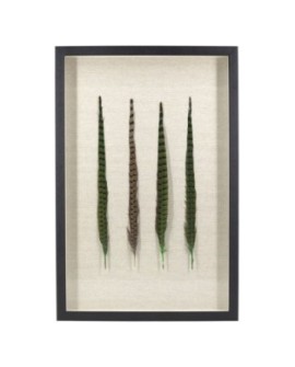 Description : Tableau vitré avec quatre plumes en disposition verticale, fabriqué en ps, verre et plumes. Encadré en coloris noir et fond beige. Système d’ancrage inclus. Aucun assemblage requis. Le complément parfait pour donner une personnalité unique aux murs de votre maison.