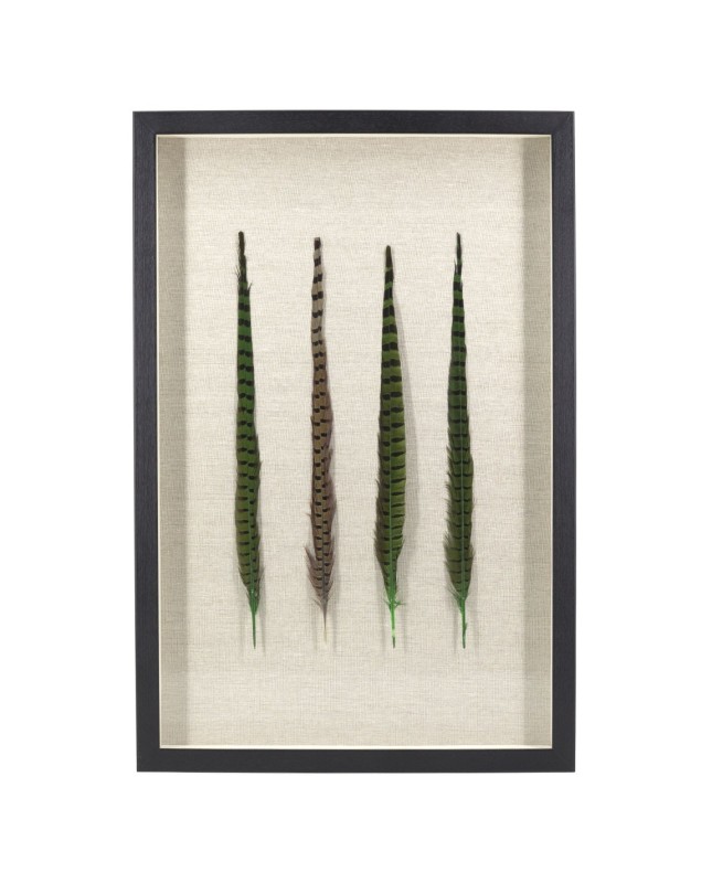 Tableau vitré avec quatre plumes en disposition verticale, fabriqué en ps, verre et plumes. Encadré en coloris noir et fond beige. Système d’ancrage inclus. Aucun assemblage requis. Le complément parfait pour donner une personnalité unique aux murs de votre maison.