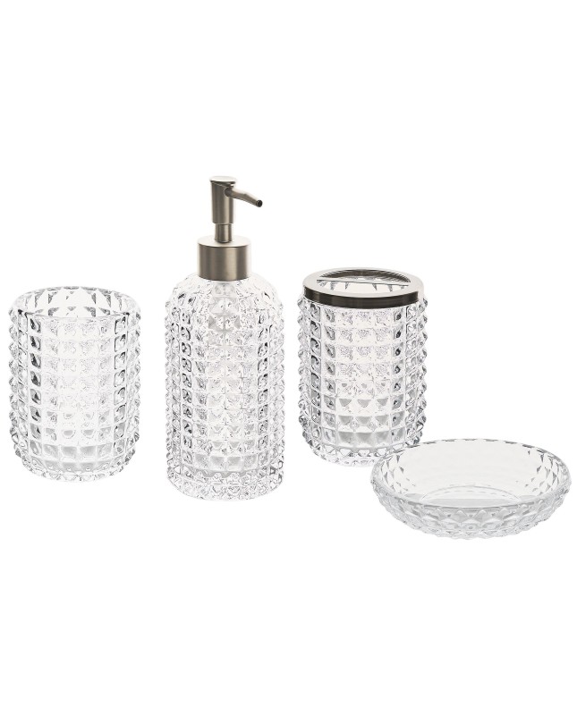 Description : Accessoires en verre glamour. Élégant et pratique, cet ensemble d'accessoires sera un complément à toute salle de bain moderne. Il comprend un distributeur rechargeable avec une pompe, un gobelet, un porte-brosse à dents et un porte-savon. Tous les éléments sont fabriqués en verre transparent avec une surface texturée accrocheuse. Cet ensemble apportera instantanément un facteur glamour à tout intérieur.Détails: Type de produit: Set d'accessoires de salle de bain Style: Moderne Couleur principale: Transparent Type de matière: Verre Matière principale: Verre Matière secondaire: Matière synthétique Dimensions: Profondeur: 9 cm Largeur: 11 cm Hauteur: 20 cm Dimensions globales: 11x9x20 Poids: 1 kg L`offre inclue: 1 x Distributeur de savon, 1 x Verre, 1x Porte brosse à dents, 1 x Porte-savon Caractéristiques clés: Design et couleur tendance, Un style simple s'adaptant à tout type d'intérieur, Décoratif et fonctionnel, De haute qualité, Matières robustes faciles à entretenir Informations d`assemblage: Ne nécessite pas d'assemblage Conseils de maintenance: Verre: 1.Nettoyez avec un chiffon et un détergent doux, essuyez bien ensuite.