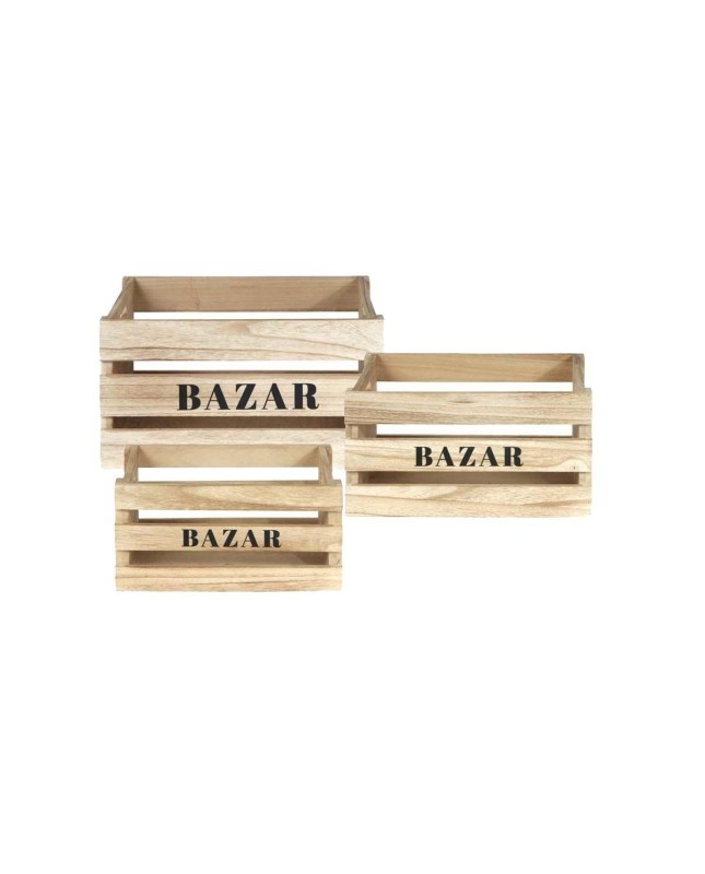 Description : Aspect : Coloris = Naturel • Matériau principal = Bois • Dimensions du grand modèle : Hauteur (en cm) = 22 • Longueur (en cm) = 40 • Profondeur (en cm) = 30 • Dimensions du moyen modèle : Hauteur (en cm) = 18 • Longueur (en cm) = 34 • Profondeur (en cm) = 25 • Dimensions du petit modèle : Hauteur (en cm) = 14 • Longueur (en cm) = 28 • Profondeur (en cm) = 19 • Autres caractéristiques : Composition = Lot de 3 cagettes de taille différente • Poids (en kg) = 0,80 • Cagettes en bois Bazar (Lot de 3)