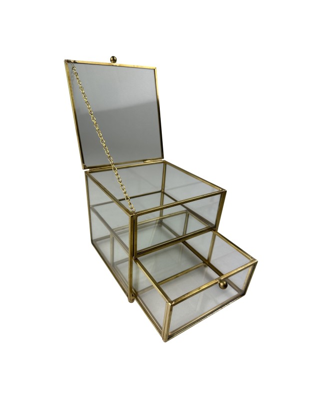 Description : Rangez élégamment vos bijoux avec cette boite jaune doré en métal. Une boîte à bijoux en verre et métal coloris doré qui joue la carte de la transparenceCette boîte à bijoux en verre et métal représente un bel objet décoratif qui peut aussi se glisser dans le séjour pour y exposer des petits secrets ! Constituée d1 tiroir dans le bas et dune partie supérieure qui s'ouvre sur le dessus avec chaînette de maintien. Dimensions 12 x 12 x 12 cm.Garantie 2 ans