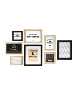 Description : Aspect : Coloris = Noir blanc Naturel • Matériau principal = Bois • Matériaux secondaires = PVC • Dimensions : Hauteur (en cm) = 27,30 • Longueur (en cm) = 22,20 • Profondeur (en cm) = 2 • Autres caractéristiques : Composition = Lot 8 cadres (3 cadres 13x18 cm - 2 cadres 10x15 cm - 2 cadres 10x10 cm - 1 cadre 15x20 cm) • Poids (en kg) = 0,44 • Lot de 8 cadres photos en bois et PVC pour apporter du fun à vos murs et ravivez les vieux souvenirs. Couleurs : blanc, noir et naturel.